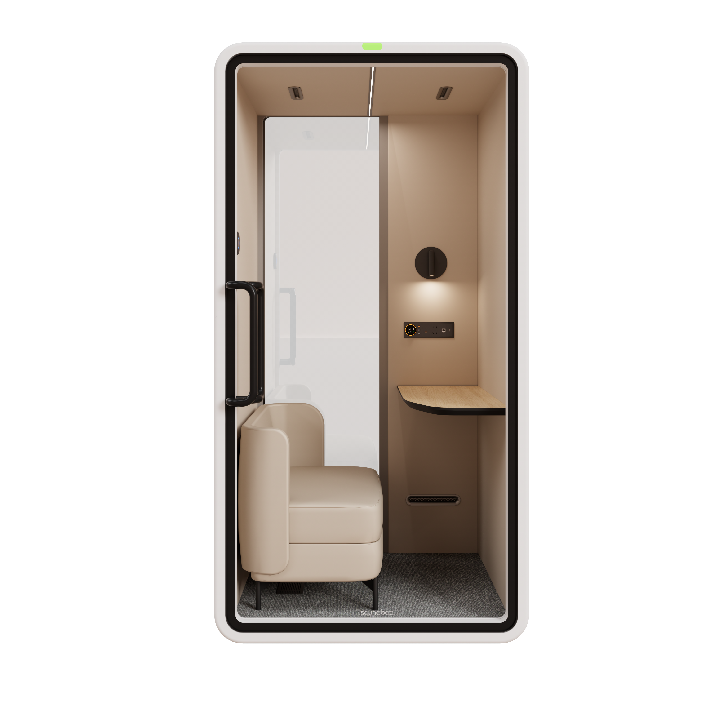 VRT- SM הוא תא אקוסטי חכם המשמש כעמדת עבודה ליחיד עבור שיחות ועבודה ממוקדת בתוך החלל הכללי. התא מספק הפחתת רעש של כ-30 dB ומאפשר יצירת סביבה שקטה ופרטית עבור המשתמש. מבנה התא האקוסטי מתוכנן בגישה מינימליסטית מוקפדת, המבנה בעל הפינות המעוגלות יוצר מראה נקי ומדויק המשתלב באופן טבעי בכל חלל. התא קומפקטי אך אינו צפוף, באמצעות חומרי גמר בהירים וטקסטורות מאוזנות, והשילוב בין משטחים אטומים ושקופים יוצר איזון בין פרטיות אקוסטית לבין קשר ויזואלי לסביבה. חלל הפנים בעל מערכת אוורור מתקדמת המייצרת זרימת אוויר רציפה, מאפשר עבודה נוחה לאורך זמן. הריהוט הארגונומי מותאם למשתמש יחיד, תוך שמירה על נוחות ופוקוס.