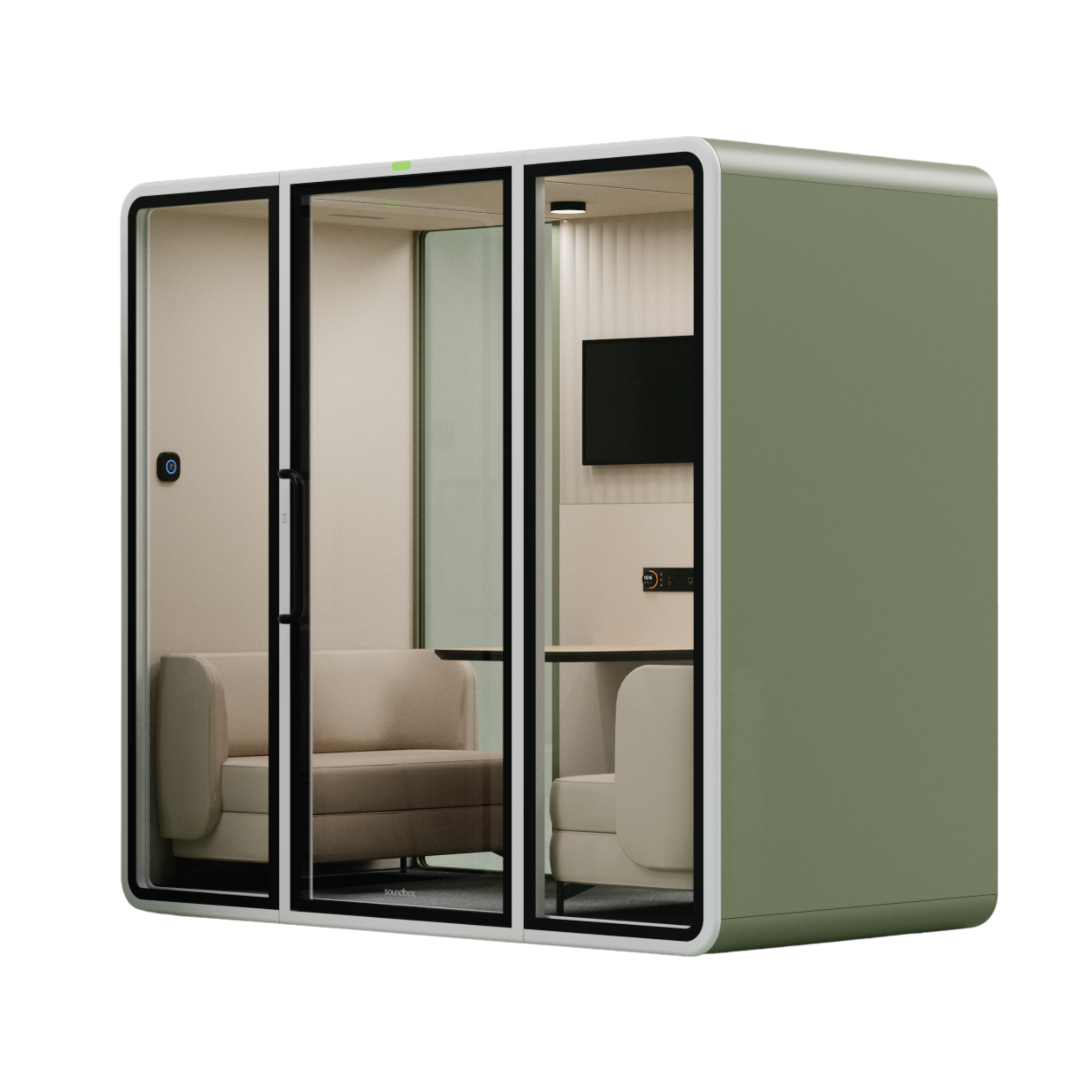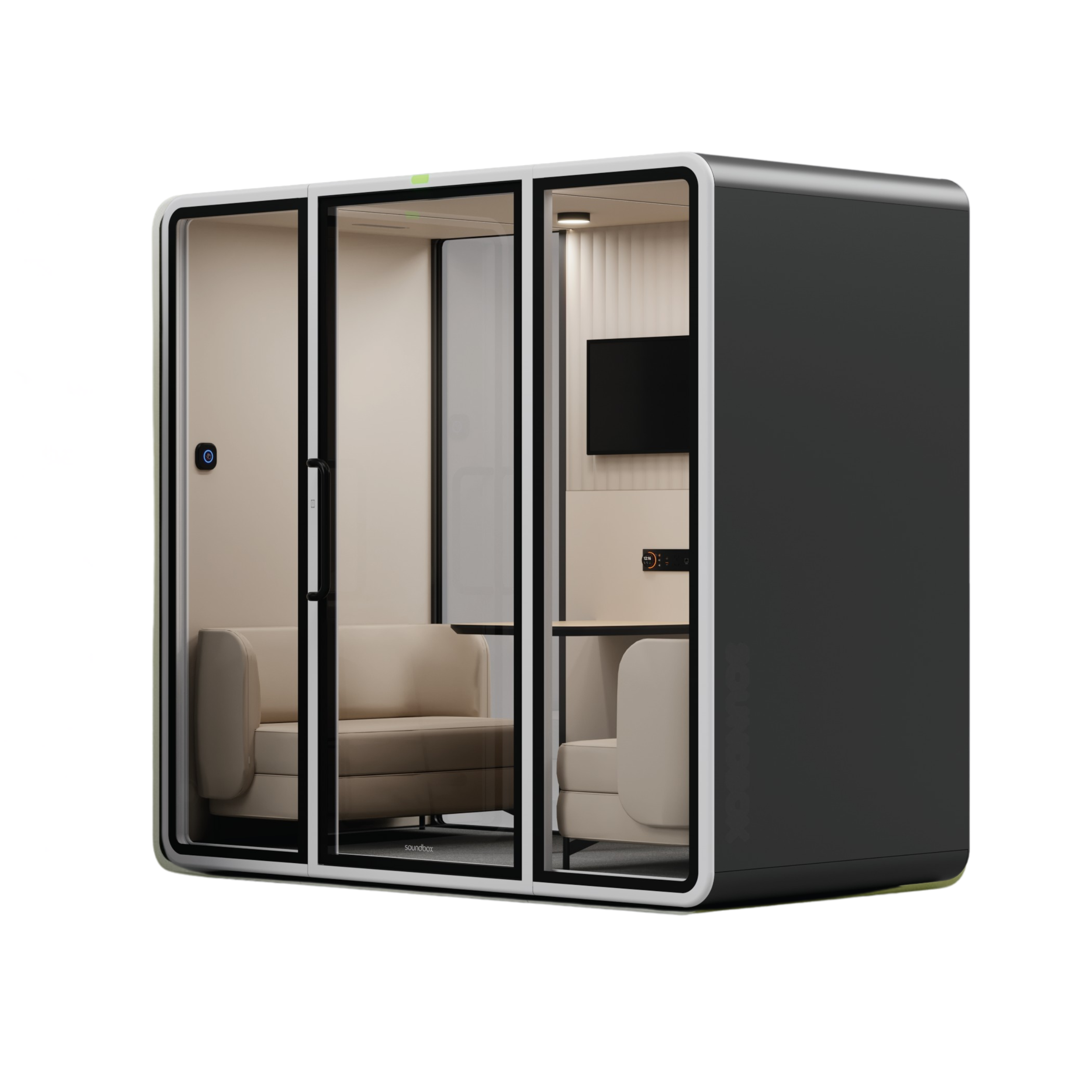 תא אקוסטי VRT L הוא תא אקוסטי חכם המשמש כתא מפגש קבוצתי (עד 6 אנשים) עבור שיחות ועבודה ממוקדת בתוך החלל הכללי. התא מספק הפחתת רעש של כ-30 dB ומאפשר יצירת סביבה שקטה ופרטית עבור המשתמש. התא מתוכנן בגישה מינימליסטית מוקפדת, המבנה בעל הפינות המעוגלות יוצר מראה נקי ומדויק המשתלב באופן טבעי בכל חלל. התא קומפקטי אך אינו צפוף, באמצעות חומרי גמר בהירים וטקסטורות מאוזנות, והשילוב בין משטחים אטומים ושקופים יוצר איזון בין פרטיות אקוסטית לבין קשר ויזואלי לסביבה. חלל הפנים בעל מערכת אוורור מתקדמת המייצרת זרימת אוויר רציפה, מאפשר עבודה נוחה לאורך זמן. הריהוט הארגונומי מותאם למשתמש יחיד ,תוך שמירה על נוחות ופוקוס.