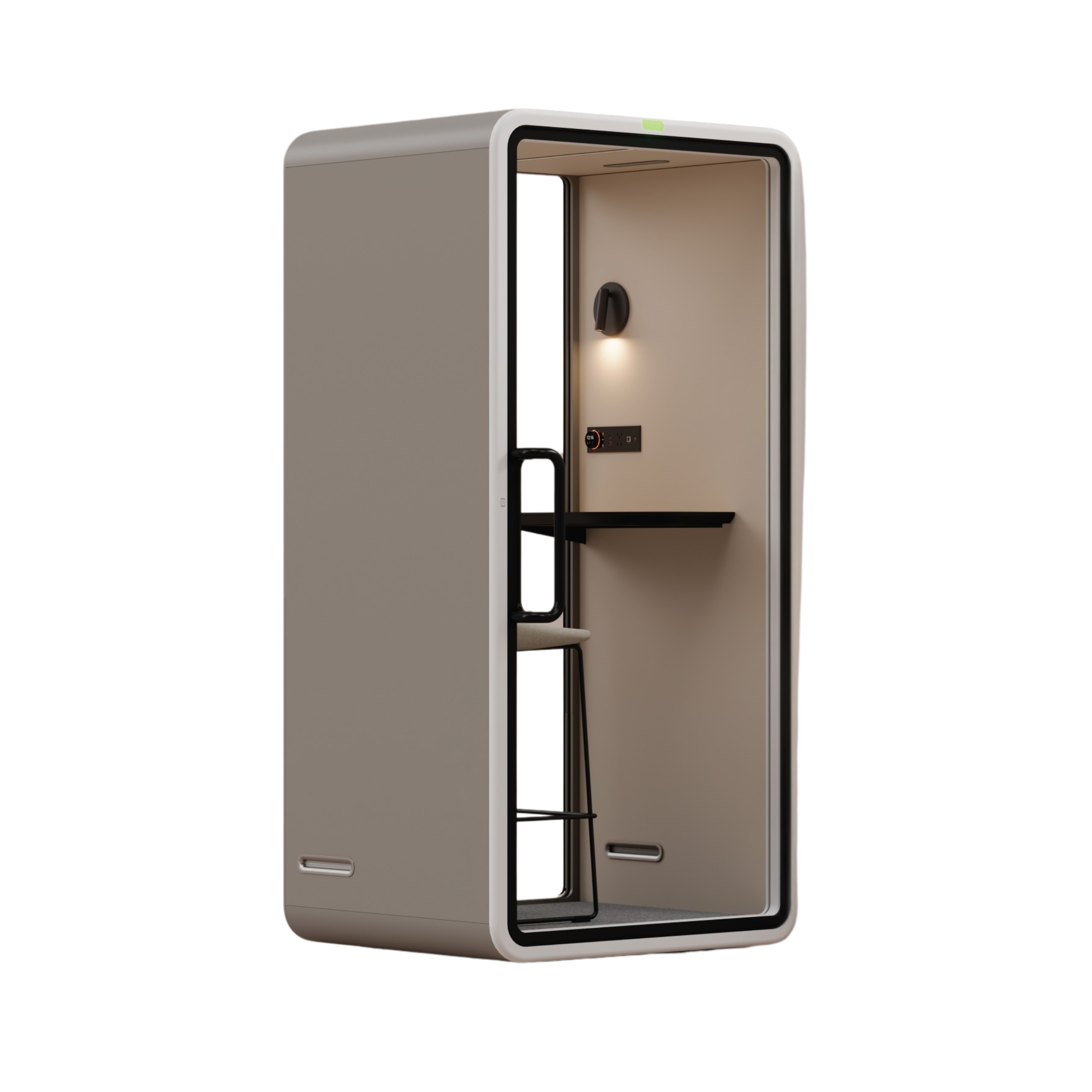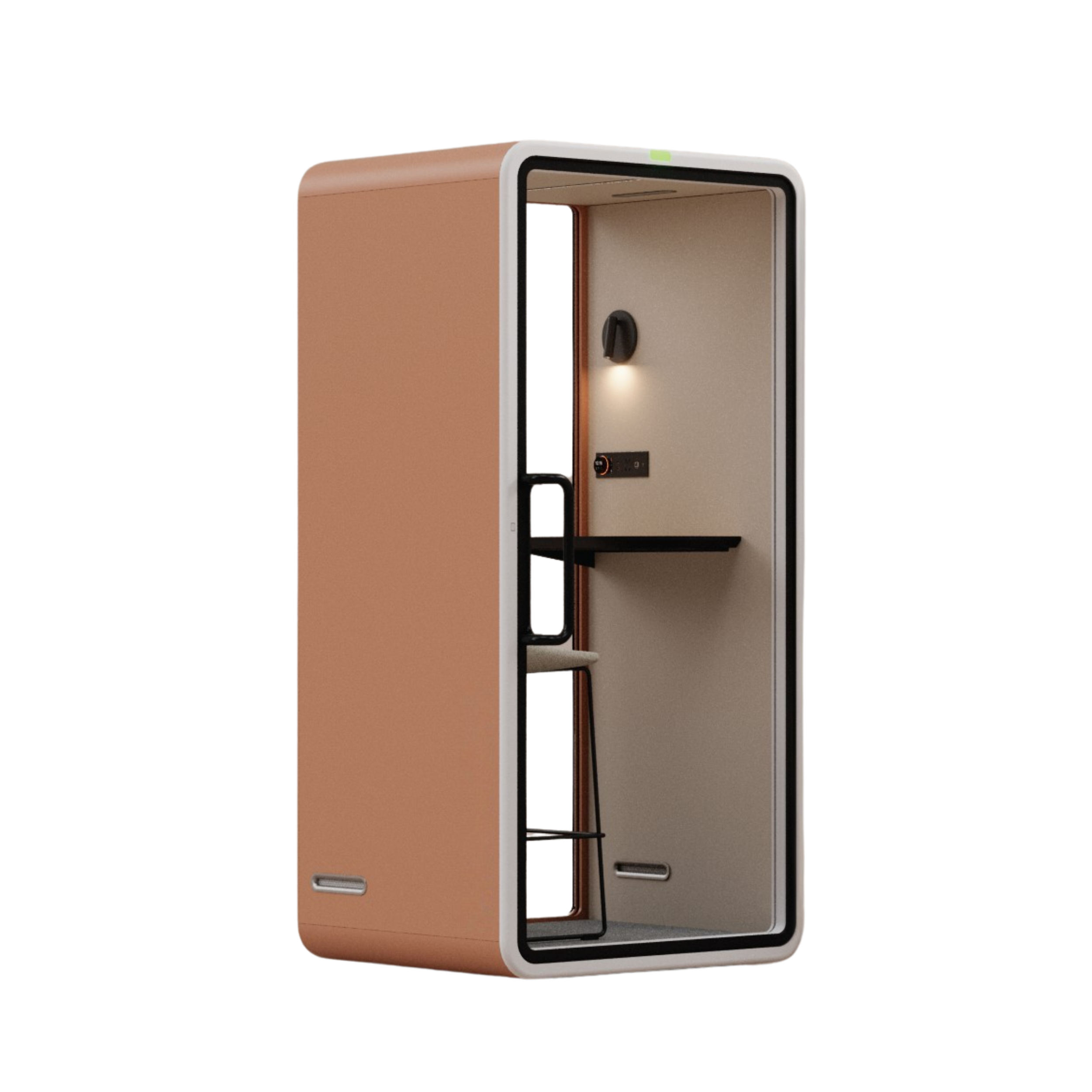 תא VRT-S הוא תא אקוסטי חכם למשתמש יחיד, המיועד לשיחות, שיחות וידאו ועבודה ממוקדת בתוך החלל הכללי. התא מספק הפחתת רעש של כ-30 dB ומאפשר יצירת סביבה שקטה ופרטית עבור המשתמש. התא מתוכנן בגישה מינימליסטית מוקפדת, המבנה בעל הפינות המעוגלות יוצר מראה נקי ומדויק המשתלב באופן טבעי בכל חלל. התא קומפקטי אך אינו צפוף, באמצעות חומרי גמר בהירים וטקסטורות מאוזנות, והשילוב בין משטחים אטומים ושקופים יוצר איזון בין פרטיות אקוסטית לבין קשר ויזואלי לסביבה. חלל הפנים בעל מערכת אוורור מתקדמת המייצרת זרימת אוויר רציפה, מאפשר עבודה נוחה לאורך זמן. הריהוט הארגונומי מותאם למשתמש יחיד ,תוך שמירה על נוחות ופוקוס. המבנה המודולרי של התא מאפשר גמישות מלאה, התקנה, התאמה ושינוי מיקום בקלות.