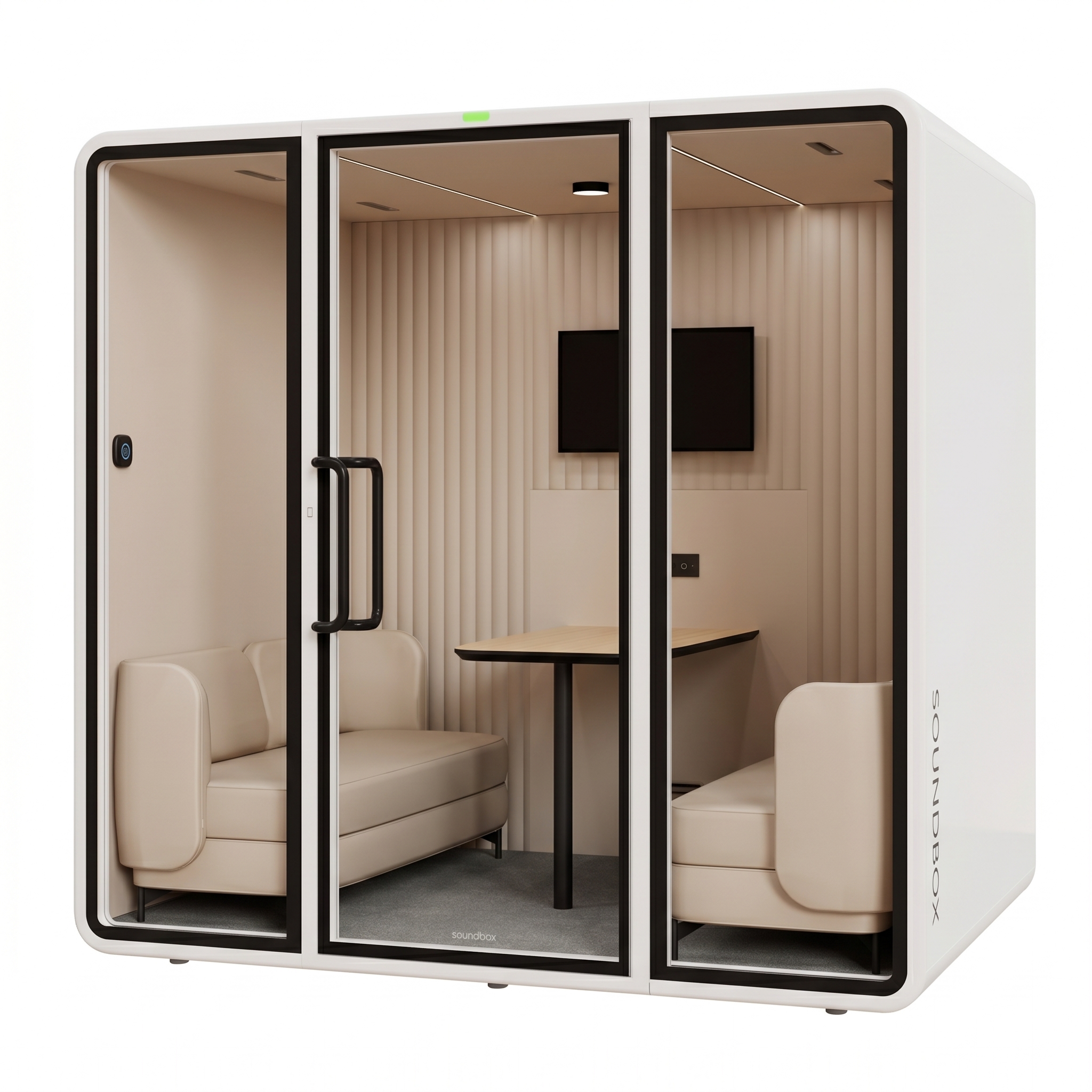 תא אקוסטי VRT plus L הוא תא אקוסטי חכם המשמש כתא מפגש קבוצתי (עד 6 אנשים) עבור שיחות ועבודה ממוקדת בתוך החלל הכללי. התא מספק הפחתת רעש של כ-30 dB ומאפשר יצירת סביבה שקטה ופרטית עבור המשתמש. התא מתוכנן בגישה מינימליסטית מוקפדת, המבנה בעל הפינות המעוגלות יוצר מראה נקי ומדויק המשתלב באופן טבעי בכל חלל. התא קומפקטי אך אינו צפוף, באמצעות חומרי גמר בהירים וטקסטורות מאוזנות, והשילוב בין משטחים אטומים ושקופים יוצר איזון בין פרטיות אקוסטית לבין קשר ויזואלי לסביבה. חלל הפנים בעל מערכת אוורור מתקדמת המייצרת זרימת אוויר רציפה, מאפשר עבודה נוחה לאורך זמן. הריהוט הארגונומי מותאם למשתמש יחיד ,תוך שמירה על נוחות ופוקוס.