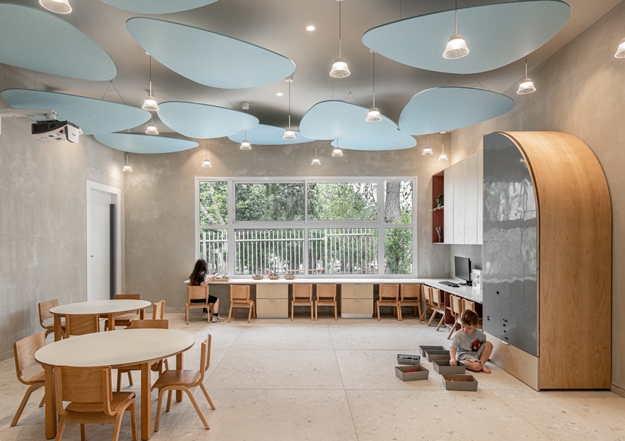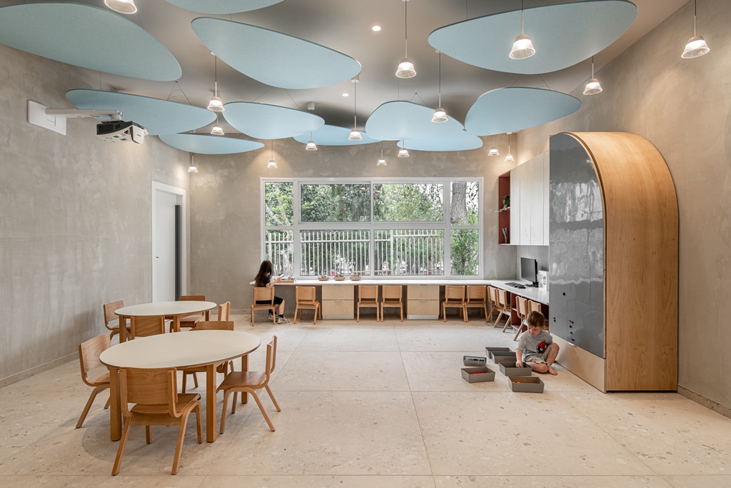 אריחי פוליאסטר צורניים - תלויים על גבי כבלים, במגוון גוונים ובגדלים שונים.